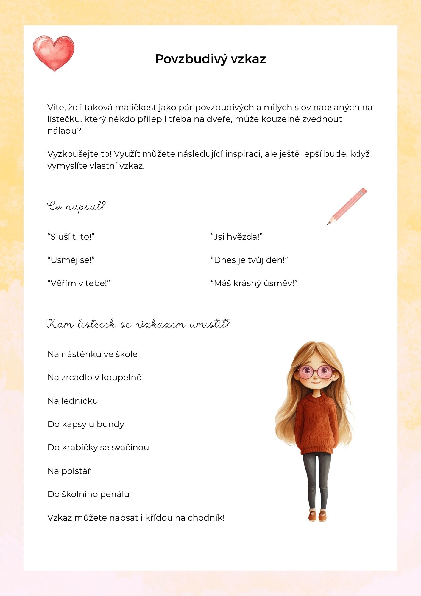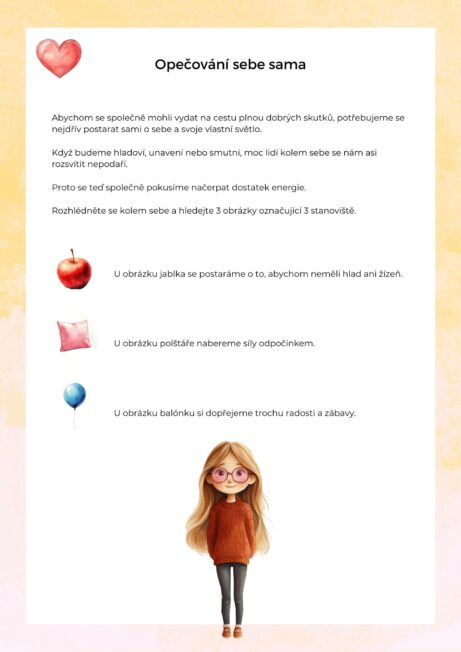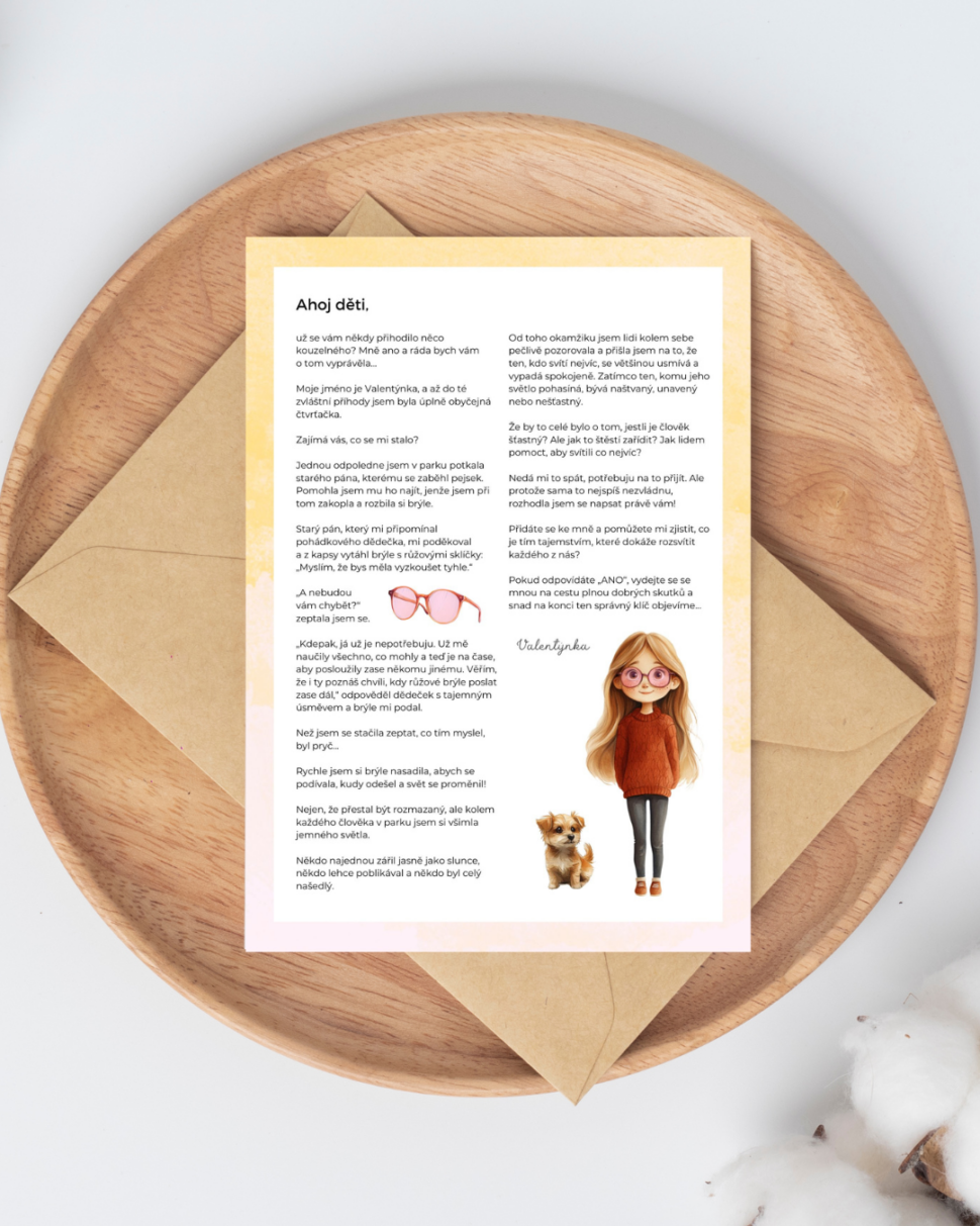 - Průběh stezkyPřečtěte si úvodní dopis od Valentýnky, vyrobte si vlastní růžové brýle a vydejte se s dětmi po jednotlivých stanovištích za objevováním laskavosti.
